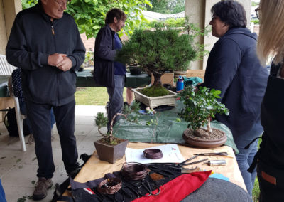 Mais que cela ne tienne, très vite l’ambiance a décollé et nous nous sommes tous surpris à en oub lié le temps ! Notre journée ne fut que de la pratique sur branche ou sujet de travail pour bien ligaturer apprendre les astuces et les erreurs à ne pas commettre. Discussions sur l’avenir de certains arbres qui méritaient une grande réflexion. Je parlerais de l’énorme pin mugo d’Agnès, de l’épicéa de Jean-François et des arbres de Michel Hélène et de tous les autres, bien évidemment.